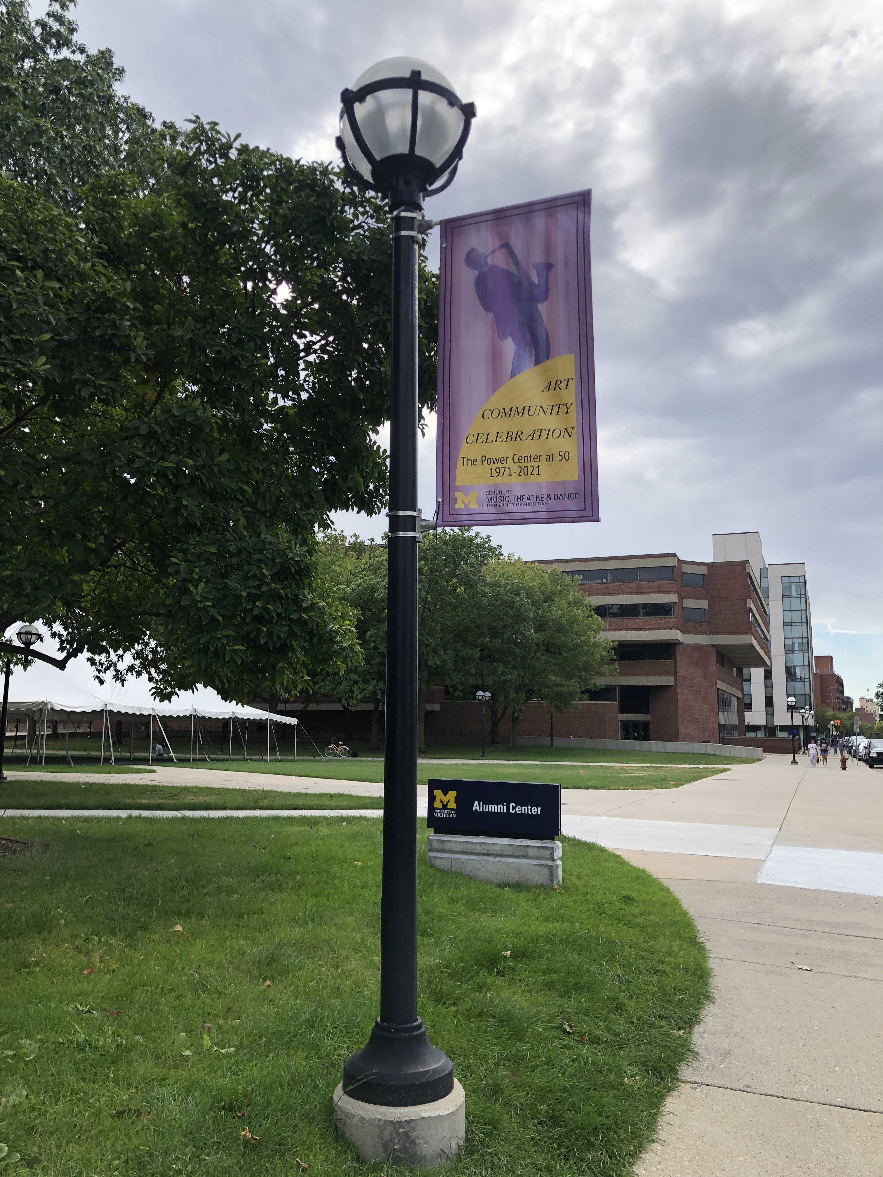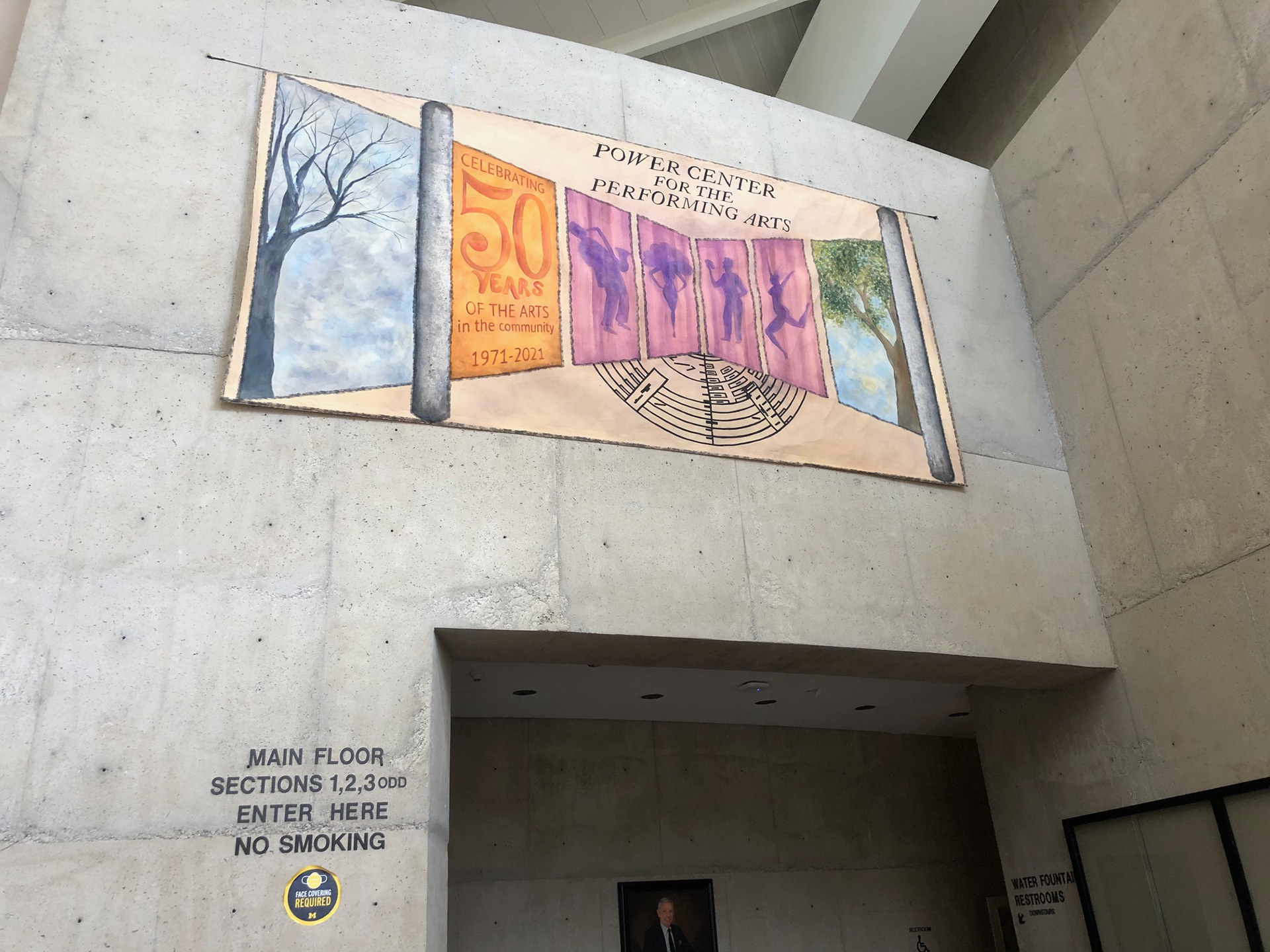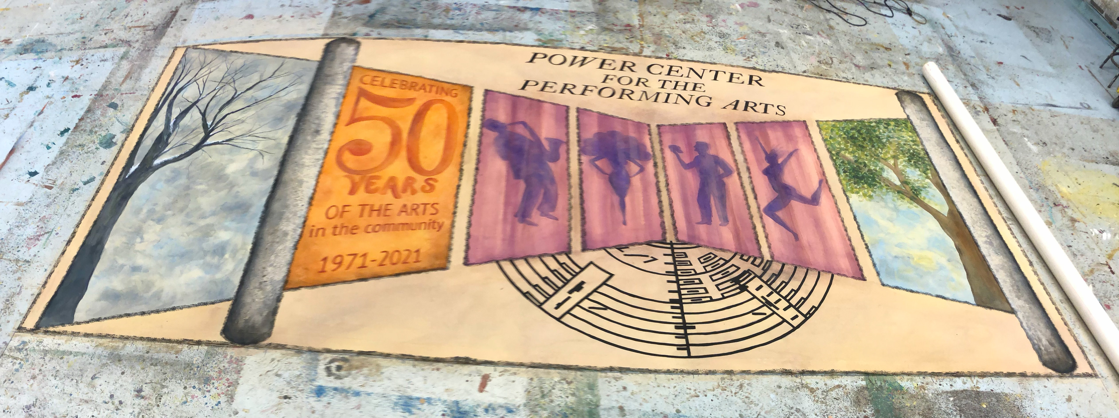 Summer of 2021, Nicole was commissioned by University Productions at The University of Michigan to design promotional materials celebrating the 50th anniversary of the Power Center Theater. Working closely with staff, she created a portfolio of silhouettes to capture the variety of acts the performing arts center had hosted for half a century. She researched the history of the iconic brutalist architecture to design and paint an 8x16ft banner that hung in the lobby during the 50th season. The work was used on street banners across downtown Ann Arbor and was later published in reading materials about the anniversary.